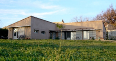 La maison est implantée sur l'angle Nord-Ouest du terrain, en son point le plus haut, afin de bénéficier au maximum de la vue et du soleil. Elle comporte une aile "de jour", orientée au sud, et une aile "de nuit" ouverte au sud et à l'est. La volumétrie en "L" comble l'angle de la parcelle et permet de dissimuler les murs de clôtures et les constructions voisines.