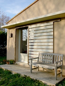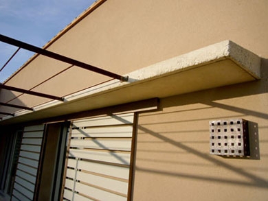 La toiture est à une seule pente, vers le nord et l'ouest, et dégage ainsi de hautes façades au sud et à l'est. Les façades sud sont percées de larges ouvertures, des persiennes coulissantes assurant leur protection.